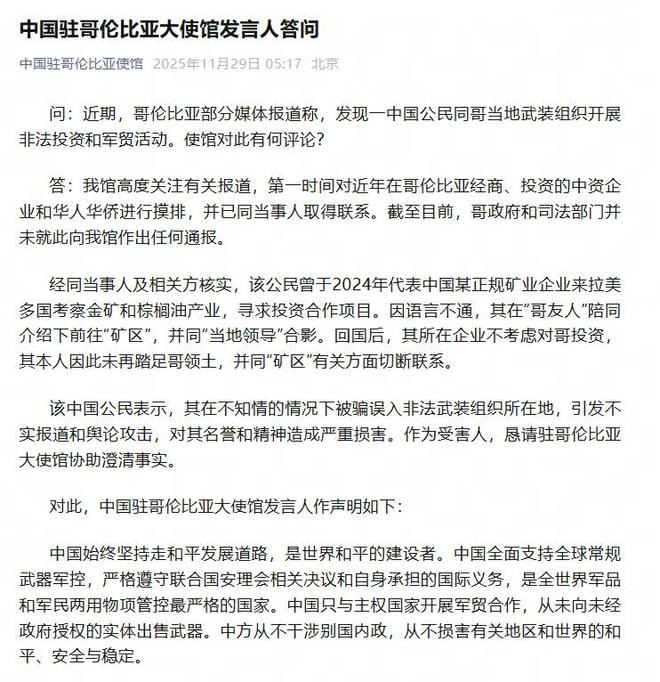 11月29日,据中国驻哥伦比亚使馆官方账号消息,中国驻哥伦比亚使馆发言人回答记者提问。 “中国驻哥伦比亚大使馆”公众号发布截图询问:近日,哥伦比亚有媒体报道称,中方人员被发现与哥伦比亚当地武装组织进行非法投资和军事商业活动。大使馆对此有何评论?答:我馆高度关注有关报道,立即对近年来在哥伦比亚经商投资的中资企业和华侨华人开展调查,并与涉案人员取得联系。截至目前,哥伦比亚政府和司法当局尚未就此向使馆通报。经向有关方面和个人核实,该国民曾于2024年代表某机构前往拉美国家。正常中国矿业公司考察金矿和棕榈油行业,探讨投资合作项目。由于语言不通,他与“兄弟朋友”一起来到一个“矿区”,并与“当地领导”合影留念。回国后,我工作的公司没有考虑在哥伦比亚投资。因此,他本人再也没有踏足哥伦比亚领土,并断绝了与“矿区”官员的联系。该中国公民表示,他在不知情的情况下被骗进入非法武装组织所在地,导致虚假报道和舆论攻击,对其名誉和声誉造成严重损害。作为受害者,我们恳请驻哥伦比亚使馆配合澄清事实。对此,中国驻哥伦比亚大使馆发言人发表声明:中国始终走和平发展道路,是世界和平的建设者。中国全力支持维护全球常规军控,严格遵守联合国安理会相关决议和自身国际义务。它是世界上对军需弹药管控最严格的国家。中国只与主权国家开展军火贸易合作,从未在未经政府许可的情况下向企业出售武器。中国绝不会干涉别国内政,不会破坏有关地区和世界的和平、安全与稳定。中国长期以来一直是哥伦比亚第二大贸易伙伴和亚洲第一大投资来源国。哥伦比亚一贯支持和鼓励与哥伦比亚的经济、商业、投资与合作,并致力于促进与哥伦比亚的经济、商业、投资与合作,并致力于促进教育领域的交流,加强人民之间的联系。哥伦比亚相关媒体有根据未经调查、未经证实的信息做出“有罪推定”,不仅损害中国人民的声誉,也严重影响哥伦比亚国家形象和中国企业赴哥投资的信心。我们敦促哥伦比亚有关媒体立即揭露不实信息,消除负面影响,共同保护哥伦比亚营商投资环境和两国人民长期友好关系。中国驻哥伦比亚使馆再次呼吁在哥华人和中资机构加强安保措施,牢固树立“海外安全第一责任”意识,谨防上当受骗,不去危险场所拆迁、投资,杜绝粗心错误,确保人民群众生命财产安全。