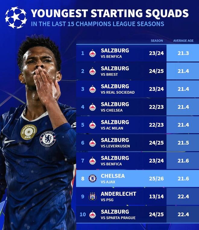 北京时间10月23日,欧冠第三轮切尔西主场5-1击败阿贾克斯。吉奥、莫伊塞斯·凯塞多、恩佐·费尔南德斯、埃斯特班和泰里克·乔治各进一球。赛后德胡安的统计显示,本场比赛切尔西首发11人的平均年龄仅为21.6岁,是近15个欧冠赛季中第八年轻的球员。过去15个赛季欧冠联赛中最年轻的10名首发球员: 1.萨尔茨堡红牛(对阵本菲卡)2023-24赛季 21.3岁 2.萨尔茨堡红牛(对阵布雷斯特)2024-25赛季 21.4岁 3.萨尔茨堡红牛(对阵皇家社会)2023-24赛季 21.4岁4.萨尔茨堡红牛(对阵切尔西)22-23赛季21.4年5.红色 萨尔茨堡公牛(对阵 AC 米兰)赛季 22-23 21.4 年 6. 萨尔茨堡红牛(对阵勒沃库森)赛季 24-25 21.5 年 7. 萨尔茨堡红牛(对阵本菲卡)赛季 2023-24 21.6 年 8. 切尔西(对阵阿贾克斯)赛季 25-26 21.6 年 9.安德莱赫特(对阵巴黎圣日耳曼)2013-14 22.4 岁 10. 萨尔茨堡红牛(vs. 布拉格斯巴达) 赛季 24-25 22.4 岁 切尔西 vs. 阿贾克斯 首发阵容:菲利普·乔根森(23 岁)。 Moisés Caicedo(23岁)、Wesley Fofana(24岁)、Adarabioyo(28岁)、Hutto(19岁)。法昆多·博纳诺特(20 岁)、拉维亚(21 岁)、恩佐·费尔南德斯(24 岁)。 S·图万(18岁)、吉奥(19岁)、比诺伊·吉滕斯(21岁) 萨尔茨堡红牛 北京时间10月23日,切尔西在欧冠第三轮比赛中主场5-10击败阿贾克斯。吉奥、莫伊塞斯·凯塞多、恩佐·费尔南德斯、埃斯特班和泰里克·乔治各进一球。赛后,德胡安的统计显示,本场比赛切尔西首发11人的平均年龄仅为21.6岁,这使他成为近15个赛季欧冠联赛中第八年轻的球员。是的。过去 15 个赛季欧冠联赛中最年轻的 10 位首发球员: 1. 萨尔茨堡红牛(对阵本菲卡) 2023-24 赛季 21.3 岁 2. 红牛萨尔茨堡(对阵布雷斯特)2024-25赛季21.4年3.萨尔茨堡红牛(对阵皇家社会)2023-24赛季21.4年4.萨尔茨堡红牛(对阵切尔西)22-23赛季21.4年5.萨尔茨堡红牛(对阵AC米兰)22-23赛季21.4年6.红色萨尔茨堡公牛(对阵勒沃库森)赛季 24-25 21.5 年 7. 萨尔茨堡红牛(对阵本菲卡)2023-24 赛季 21.6 年 8. 切尔西(对阵阿贾克斯)25-26 赛季 21.6 年 9. 安德莱赫特(对阵巴黎圣日耳曼)赛季 13-14 22.4 年 10. 萨尔茨堡红牛(对阵布拉格斯巴达)24-25 赛季22.4 岁 切尔西 vs. 阿贾克斯 首发阵容:菲利普·乔根森 (23 岁)。 Moisés Caicedo(23岁)、Wesley Fofana(24岁)、Adarabioyo(28岁)、Hutto(19岁)。法昆多·博纳诺特(20 岁)、拉维亚(21 岁)、恩佐·费尔南德斯(24 岁)。 S·图万(18岁)、吉奥(19岁)、比诺伊·吉滕斯(21岁) 北京时间10月23日,欧冠第三轮,切尔西主场5-10击败阿贾克斯。吉奥、莫伊塞斯·凯塞多、恩佐·费尔南德斯、埃斯特班和泰里克·乔治各进一球。赛后德胡安的统计显示,本场比赛切尔西首发11人的平均年龄仅为21.6岁,是近15个欧冠赛季中第八年轻的球员。过去15个赛季欧冠联赛中最年轻的10名首发球员: 1.萨尔茨堡红牛(对阵本菲卡)2023-24赛季 21.3岁 2.萨尔茨堡红牛(对阵布雷斯特)2024-25赛季 21.4岁 3.萨尔茨堡红牛(对阵皇家社会)2023-24赛季 21.4岁4. 萨尔茨堡红牛 (vs. 切尔西) 22-23赛季 21.4 年 5. 萨尔茨堡红牛(对阵 AC 米兰)22-23 赛季 21.4 年 6. 萨尔茨堡红牛(对阵勒沃库森)24-25 赛季 21.5 年 7. 萨尔茨堡红牛(对阵本菲卡)2023-24 赛季 21.6 年 8. 切尔西(对阵阿贾克斯)25-26 赛季 21.6 年9.安德莱赫特(对阵巴黎圣日耳曼)2013-14赛季 22.4 年 10. 萨尔茨堡红牛 (vs. 布拉格斯巴达) 24-25 赛季 22.4 年 切尔西 vs. 阿贾克斯 首发g XI:菲利普·乔根森(Filip Jorgensen)(23岁)。 Moisés Caicedo(23岁)、Wesley Fofana(24岁)、Adarabioyo(28岁)、Hutto(19岁)。法昆多·博纳诺特(20 岁)、拉维亚(21 岁)、恩佐·费尔南德斯(24 岁)。 S·图万(18岁)、吉奥(19岁)、比诺伊·吉滕斯(21岁) 萨尔茨堡红牛 北京时间10月23日,切尔西在欧冠第三轮比赛中主场5-10击败阿贾克斯。吉奥、莫伊塞斯·凯塞多、恩佐·费尔南德斯、埃斯特班和泰里克·乔治各进一球。赛后德胡安的统计显示,本场比赛切尔西首发11人的平均年龄仅为21.6岁,是近15个欧冠赛季中第八年轻的球员。过去15个赛季欧冠联赛中最年轻的10名首发球员: 1. 萨尔茨堡红牛(对阵本菲卡) 临时 23-24 21.3岁 2. 萨尔茨堡红牛(对阵布雷斯特) 24-25赛季 21.4岁 3. 萨尔茨堡红牛(对阵皇家社会) 23-24赛季 21.4岁 4. 萨尔茨堡红牛(vs 切尔西)赛季 22-23 21.4 年 5. 萨尔茨堡红牛(vs AC 米兰)赛季 22-23 21.4 年 6. 萨尔茨堡红牛(vs 勒沃库森)赛季 24-25 21.5 年 7. 萨尔茨堡红牛(vs 本菲卡)赛季 23-24 21.6 年 8. 切尔西(vs 阿贾克斯)赛季25-26 21.6岁 9.安德莱赫特(vs巴黎 圣日耳曼)赛季13-14 22.4岁 10.红牛萨尔茨堡(对阵布拉格斯巴达)赛季24-25 22.4岁 切尔西对阵阿贾克斯首发十一人:菲利普·乔根森(23岁)。 Moisés Caicedo(23岁)、Wesley Fofana(24岁)、Adarabioyo(28岁)、Hutto(19岁)。法昆多·博纳诺特(20 岁)、拉维亚(21 岁)、恩佐·费尔南德斯(24 岁)。 S·图万(18岁)、吉奥(19岁)、比诺伊·吉滕斯(21岁) 萨尔茨堡红牛 北京时间10月23日,切尔西在欧冠第三轮比赛中主场5-10击败阿贾克斯。吉奥、莫伊塞斯凯塞多、恩佐·费尔南德斯、埃斯特万和泰里克·乔治各进一球。赛后,德胡安的统计数据显示,C罗的平均年龄赫尔西本场比赛的首发11人年龄只有21.6岁,是过去15个欧冠赛季中第八年轻的球员。过去15个赛季欧冠联赛中最年轻的10名首发球员: 1.萨尔茨堡红牛(对阵本菲卡)2023-24赛季 21.3岁 2.萨尔茨堡红牛(对阵布雷斯特)2024-25赛季 21.4岁 3.萨尔茨堡红牛(对阵皇家社会)2023-24赛季 21.4岁4.萨尔茨堡红牛(对阵切尔西)22-2