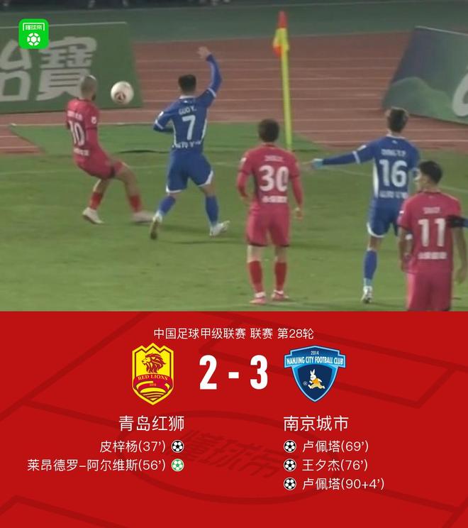 北京时间10月25日,中国足球甲A联赛第28轮比赛,青岛红狮主场迎战南京城。青岛红狮队皮子岩进球,阿尔维斯进球。南京队的卢佩塔梅开二度,王希杰进球。最终比分青岛红狮2-3南京城。关键赛事:第37分钟,皮子阳远射越过门顶破门。青岛红狮1-0南京。第56分钟,皮子阳破门,阿尔维斯主罚点球。青岛红狮2-0。第70分钟,他们获得角球机会。卢佩塔得分并追回一分。南京城1-2青岛红狮。第76分钟,袁浩传球。王希杰射门扳平比分。南京城2-2青岛红狮。第90分钟和第4分钟,卢佩塔接到于梦辉的传球射门取得领先。南京城3-2青岛红狮。双方球员均参加了比赛。比赛马上就要开始了。任意球第8分钟判罚。董洪林抽射偏出。第23分钟,卢佩塔突入禁区。我胸口一停,转身抽射,球击中横梁顶部,出了底线。第28分钟,卢佩塔撞倒莱安德罗·阿尔维斯,裁判向他出示黄牌。第37分钟,皮子阳拿球,突破到门顶,远射破门。青岛红狮1-0南京。第56分钟,皮子阳破门,阿尔维斯主罚点球。青岛红狮2-0。第70分钟,他获得角球机会。卢佩塔得分并扳回一分。南京城1-2青岛红狮。第76分钟,王希杰趁袁浩传球扳平比分。南京城2-2青岛红狮。第90分钟和第4分钟,卢佩塔接余梦辉传球射门。技术统计 南京城3-2青岛红狮